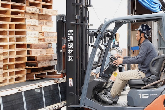 下川入デポに集められた使用済み製紙パレットを、相模デポまで運びます。